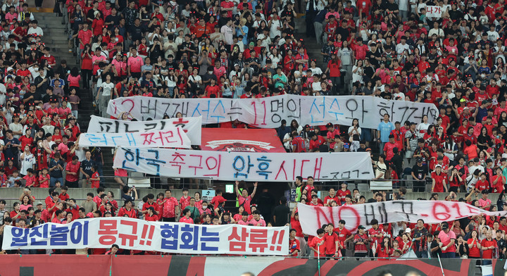 이날 경기장에는 축구 팬들, 특히 대표팀 공식 서포터즈 '붉은악마' 쪽에서 축구협회와 정몽규 대한축구협회장, 홍명보 감독 등을 비판하는 걸개가 걸렸고, 경기 시작 전 '정몽규 나가', '홍명보 나가' 등의 구호를 외치며 야유를 보냈다.