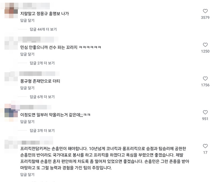 이에 팬들은 "XX말고 정몽규, 홍명보 나가라" "방패막이로 든든하다는거냐" "선수 앞세워서 물타기하지마라" 등의 비판을 쏟아내며 날카로운 반응을 보였다.