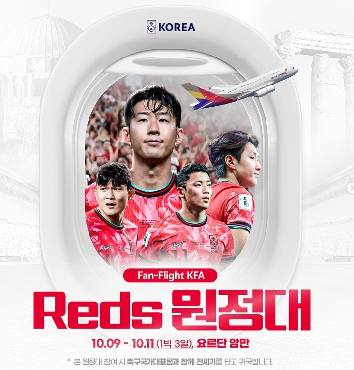 축구협회는 지난 3일 공식 SNS를 통해 요르단 원정 경기에 함께 할 'Reds 원정대'를 선착순 100명 한정으로 모집하는 공지를 띄웠다. 가격은 1인 기준 100만원(일반석 항공료, 지상비, 여행자보험 및 비자 포함)이며 숙박은 2인 1실을 사용하게 된다.