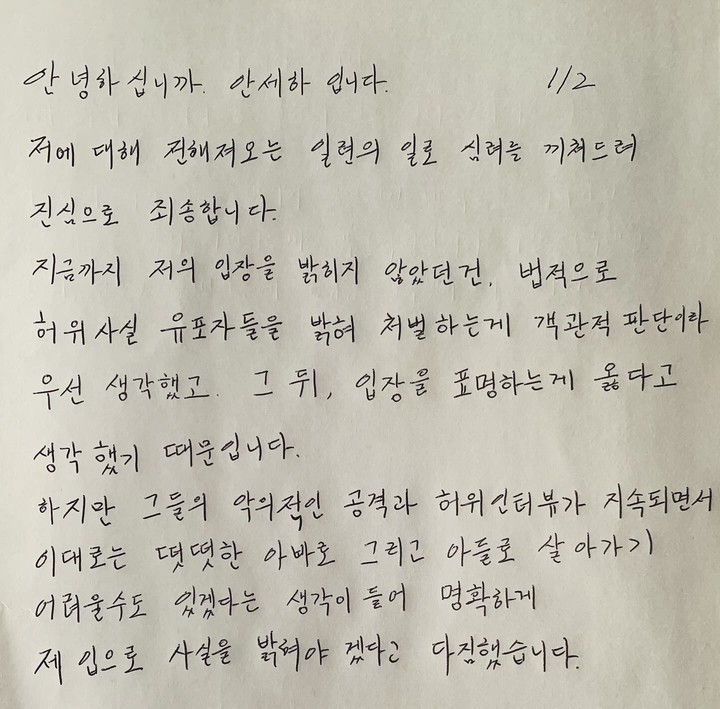 하지만 그들의 악의적인 공격과 허위 인터뷰가 지속되면서 이대로는 떳떳한 아빠로 그리고 아들로 살아가기 어려울 수도 있겠다는 생각이 들어 명확하게 제 입으로 사실을 밝혀야겠다고 다짐했습니다.