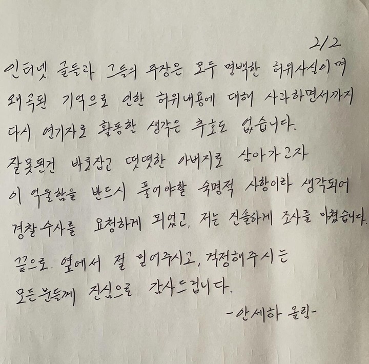 또한 안세하는 "잘못된 건 바로잡고 떳떳한 아버지로 살아가고자 이 억울함을 반드시 풀어야 할 숙명적 사항이라 생각해 경찰 수사를 요청하게 되었고, 진솔하게 조사를 마쳤다"고 억울함을 재차 강조했다.