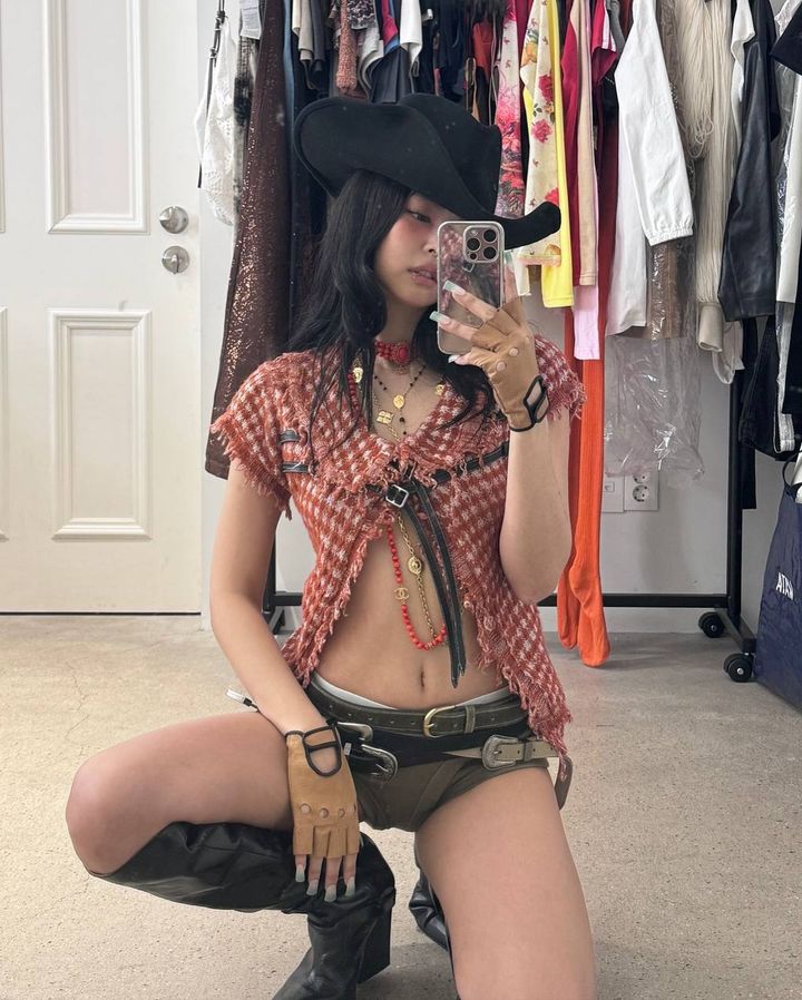 또한 카우걸로 변신한 제니는 쇄골부터 복부까지 파인 상의를 비롯해 카키색 핫팬츠를 소화하며 군살 없는 몸매를 드러냈다.