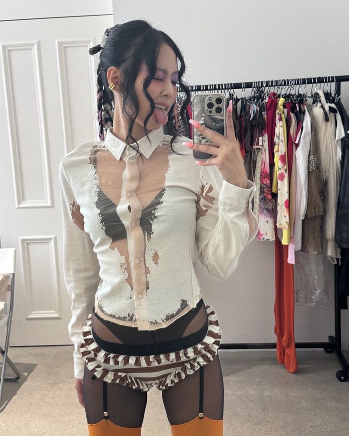 공개된 사진 속 제니는 시스루 셔츠를 비롯해 겨자색 가터벨트, 검은색 스타킹을 소화했고, 팬티 위 레이스 장식이 눈길을 끄는 팬티를 겹쳐 입어 파격적인 스타일링에 나섰다.