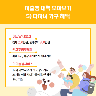 올해부터 첫만남 이용권이 둘째 자녀 이상인 경우 기존 200만 원에서 300만 원으로 상향됐다. 산후조리도우미 서비스도 다둥이 가정을 위해 최대 4명까지 지원한다. 신생아 수와 관리사의 비율을 일대일로 하여 최대 4명까지 지원하고 있다. 기간도 최장 25일에서 40일로 확대했다.