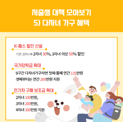 다자녀 가구의 전기차 구매 보조금도 내년 확대된다. 2자녀 100만 원, 3자녀 200만 원, 4자녀 300만 원 등 자녀 수에 따라 전기차 구매 보조금이 추가되었다.