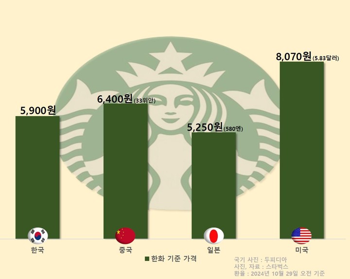 특히, 1인당 GDP(국내총생산) 기준 한국(2023년 기준 약 3만5600달러)과 약 세 배 차이나는 중국(약 1만2174달러)의 경우, 29일 오전 환율 기준 더 한국보다 500원가량 비쌌으며, 인상된 가격(6100원)을 생각해도 한국 스타벅스 가격이 저렴했다. 스타벅스 가격책정은 현지 물가 등을 고려하는 것으로 알려졌다.