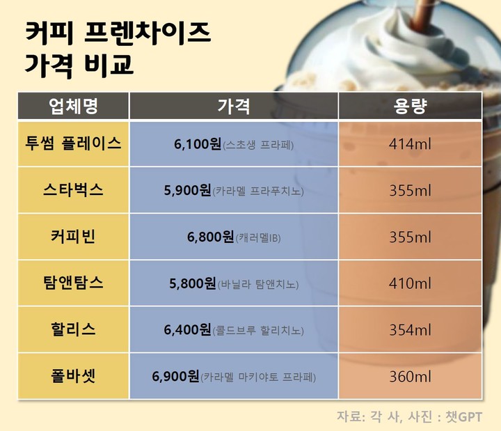 국내 커피 프렌차이즈별 가격을 비교해도 스타벅스가 상대적으로 저렴했다. 가장 비싼 곳은 '폴바셋'의 '카라멜 마키야토 프라페'가 6900원으로 스타벅스보다 1000원 비쌌다. 그 다음으로는 '커피빈'의 '캐러멜IB'이 6800원(900원▲), '할리스'의 '콜드브루 할리치노'가 6400원(500원▲), '투썸 플레이스'의 '스초생 프라페'가 6100원(200원▲), '탐앤탐스'의 '바닐라 탐앤치노'가 5800원(100원▼)으로 뒤를 이었다. 상승된 가격을 감안해도 순위에는 큰 차이가 없었다. 다만, 용량에서는 스타벅스가 적은 편에 속했다.