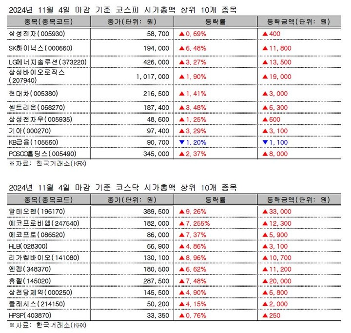 시가총액 기준 코스피 상위 10개 종목은 KB금융(105560)을 제외하고 모두 상승했으며, 코스닥 상위 10개 종목은 모두 상승했다.
