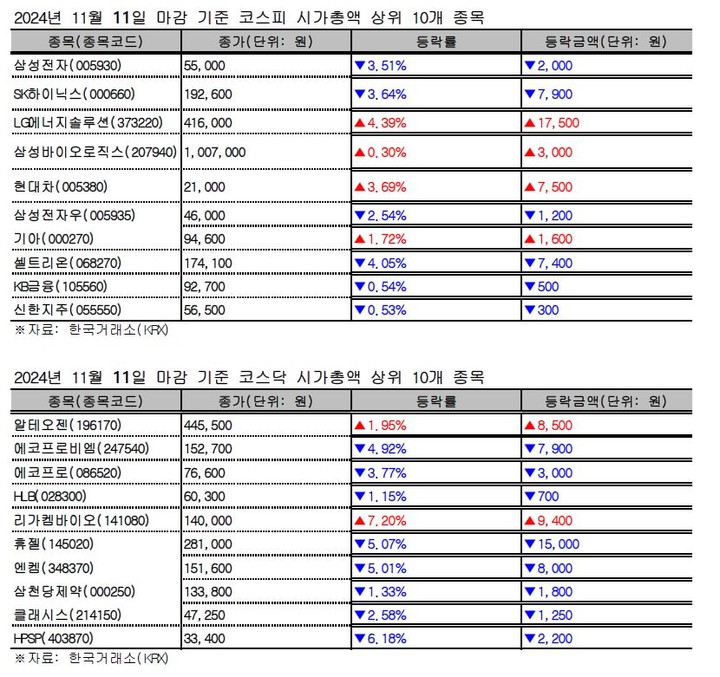 이하 11일 코스피&코스닥 시가총액 기준 상위 10개 종목리스트