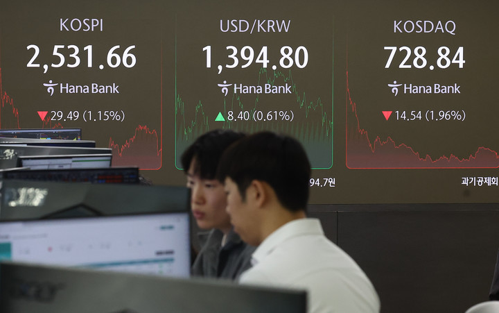 이날 한국거래소(KRX)에 따르면, 이날 코스피 지수는 2531.66포인트로 전 거래일 대비 29.49포인트(▼1.15%) 하락 마감했다. 또한, 코스닥 지수는 728.84포인트로 전 거래일 대비 14.54포인트(▼1.96%) 하락했다.