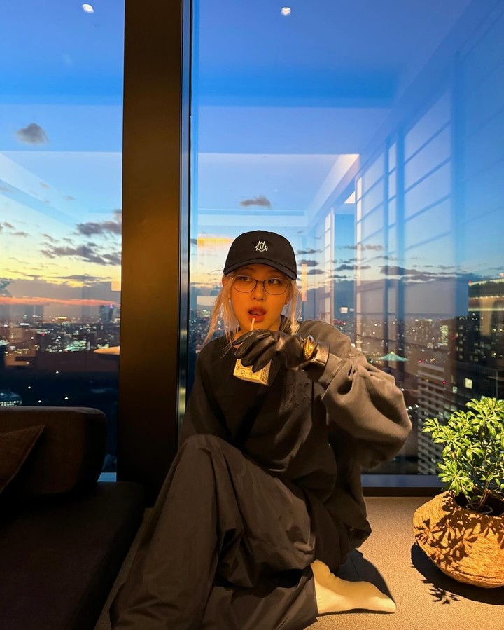 다음은 로제가 긱 시크룩을 소화하며 포즈를 취하고 있는 모습이다. 긱 시크는 괴짜의 '긱'과 세련됨의 '시크'가 합쳐진 말로, 엉뚱하고 너드스러운 분위기를 트렌디하게 재해석한 룩이다.