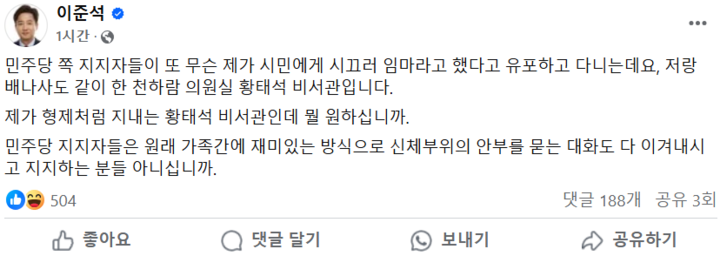 "민주당 쪽 지지자들이 제가 시민에게 ‘시끄러 임마’라고 했다고 유포하고 있습니다. 하지만 이는 천하람 의원실 황태석 비서관과의 형제 같은 관계에서 나온 농담이었습니다."