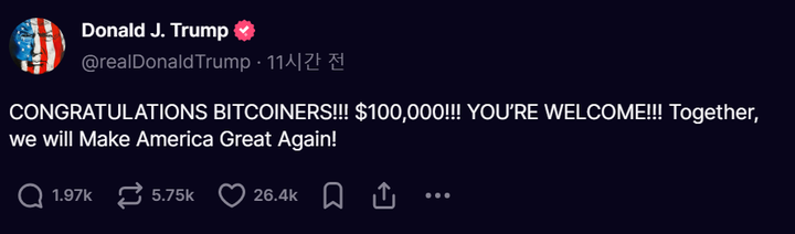 현지시간 기준 5일 트럼프 전 대통령은 자신의 SNS '트루스소셜'을 통해 "코인러들 축하합니다", "우리는 다시 미국을 위대하게 만들 것(MAGA)"이라는 등 축하의 말을 전했다.
