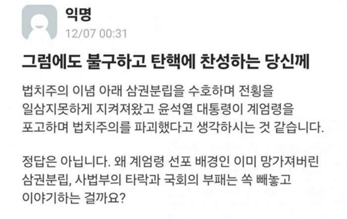 A 씨는 지난 7일 대학생 온라인 커뮤니티 성균관대학교 '에브리타임'에서 '그럼에도 불구하고 탄핵에 찬성하는 당신께'라는 제목으로 글을 게시해 "왜 계엄령 선포 배경인 이미 망가져버린 삼권분립, 사법부의 타락과 국회의 부패는 쏙 빼놓고 이야기하는 걸까요?"라고 되물었다. 에브리타임은 대학교 인증을 한 회원만 가입해 글을 작성할 수 있다.