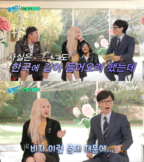 로제는 "사실 브루노 마스도 한국에 같이 와서 유퀴즈에 초대해 출연하기로 해서 엄청 기대했는데 비자 문제 때문에..."라고 아쉬움을 표했고, 이에 유재석은 "비자 때문에...? 아니 그거 어떻게 되는 건데"라고 격분하며 아쉬움을 토로했다.