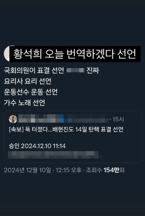 11일 황 번역가는 "황석희 오늘 번역하겠다 선언"이라며 "국회의원이 표결 선언 XXX 진짜. 요리사 요리 선언. 운동선수 운동 선언. 가수 노래 선언"이라는 글과 함께 국민의힘 배현진 의원의 탄핵 표결 선언 관련 기사를 캡처해 올렸다.
