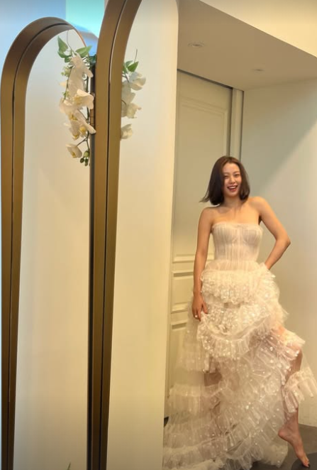 사진 속 그는 어깨와 팔이 없는 탑 형태의 드레스를 착용한 모습이었다. 허리 부터 발끝까지는 레이스와 투명 시스루 원단이 교차된 디자인으로 아찔한 자태를 드러냈다.