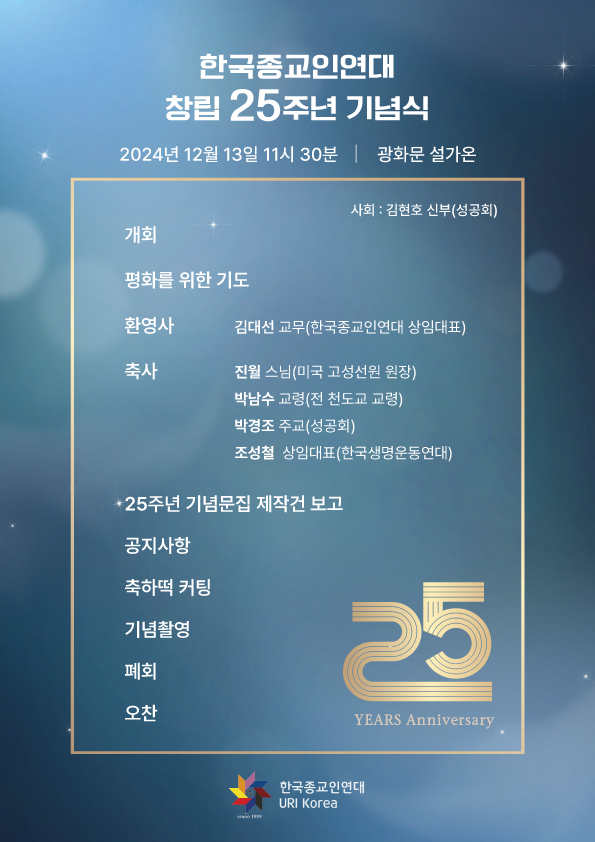 이번 25주년 기념문집에는 URI 창립자인 월리암 스윙 대주교를 비롯해 주호영 국회부의장, 김대선 상임대표 등 여러 종교 지도자와 인사들의 글이 실렸다. 김대선 대표는 “종교 간 신뢰와 협력을 바탕으로 지속 가능성과 세대 간 연대를 강화하며 한반도 평화와 세계 종교 연합의 선도적 역할을 수행하겠다”고 밝혔다.