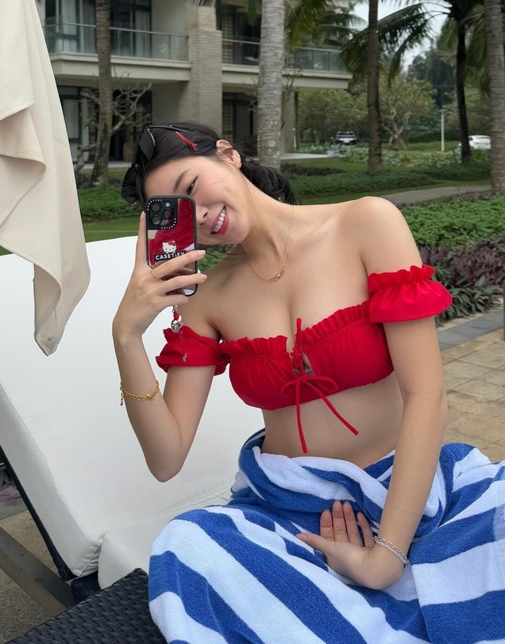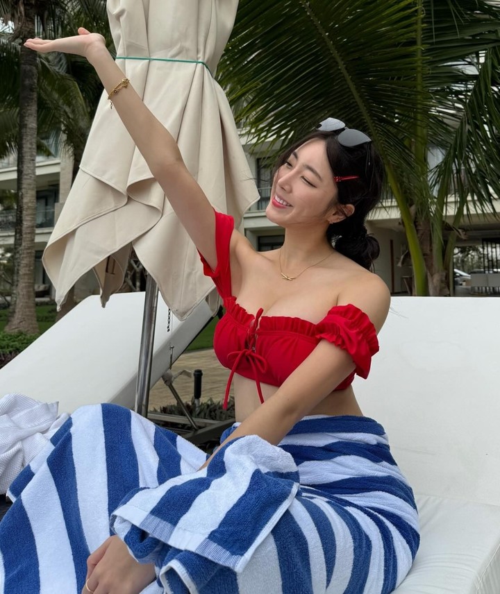 해당 사진 속 안지현은 가슴의 볼륨감이 아찔하게 부각되는 붉은 트임 비키니 차림으로 늘씬한 몸매를 드러내고 있다. 한적한 풀장과 야자수 속에서 여유를 즐기는 가운데 군더더기 없는 바디라인이 시선을 사로잡는다.