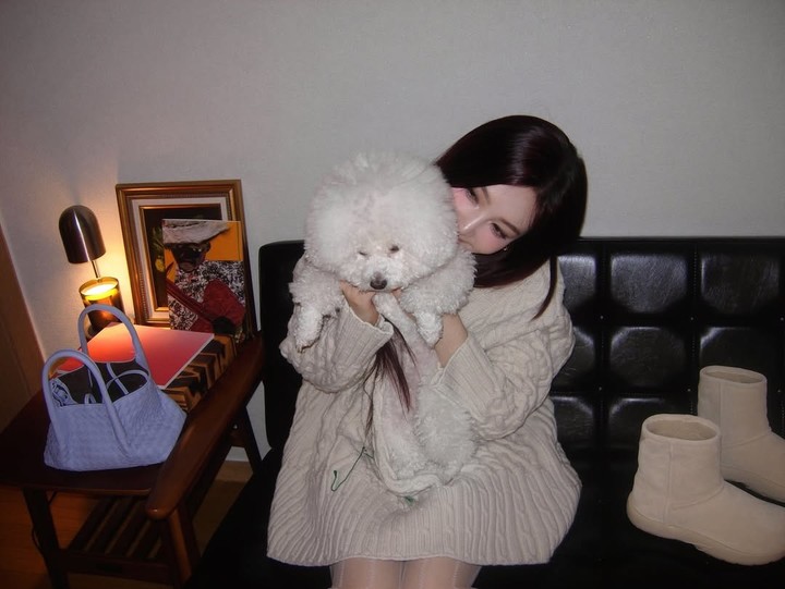 사진 속 조이는 아이보리색 니트 원피스에 하늘색 보테가베네타 가방을 매치했고, 흰색 줄무늬 디테일이 있는 스타킹을 착용해 청순하면서도 사랑스러운 룩을 보여줬다. 와인색 헤어에 흰색 헤어핀으로 포인트를 줘 귀여운 매력을 더했다.