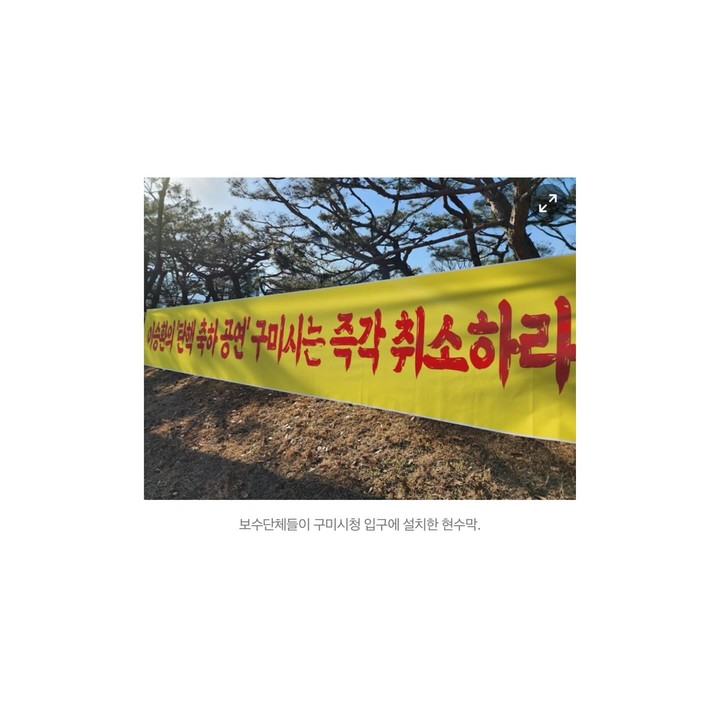 해당 현수막은 지난 19일 경북 구미시청 앞에서 이승환의 구미 콘서트 취소를 촉구한 보수단체가 설치한 것으로, '이승환의 탄핵 축하 공연, 구미시는 즉각 취소하라'라고 적혀있다.
