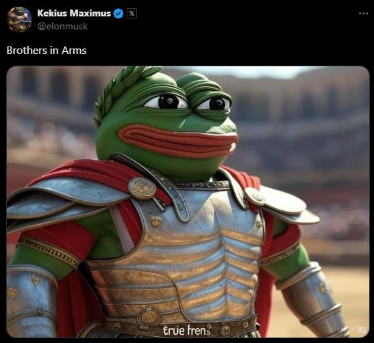1일(현지시간) 영국 BBC방송 등 외신에 따르면 일론 머스크는 전날 자신의 엑스 계정 이름을 '케키우스 막시무스'로 변경했다. 이와 함께 프로필 사진을 인터넷 커뮤니티 밈(meme)으로 자주 등장하는 '개구리 페페'(Pepe the Frog) 캐릭터가 게임 콘솔을 들고 있는 이미지로 변경했다.