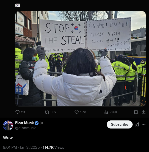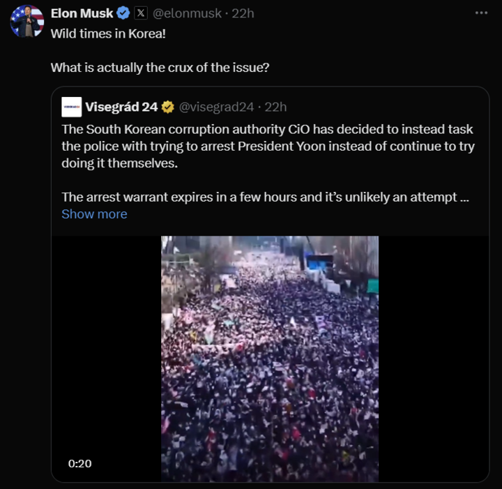 머스크가 인용한 원본 게시물에는 고위공직자범죄수사처(공수처)가 윤석열 대통령에 대한 체포영장 집행을 경찰에 넘기기로 했으며, 체포 영장 시한이 만료된다는 것과 윤 대통령에 대한 지지가 높아지고 있다는 내용이 담겼다. 또한 첨부한 영상이 윤 대통령 지지자들의 집회 현장을 보여준다고 언급했다.