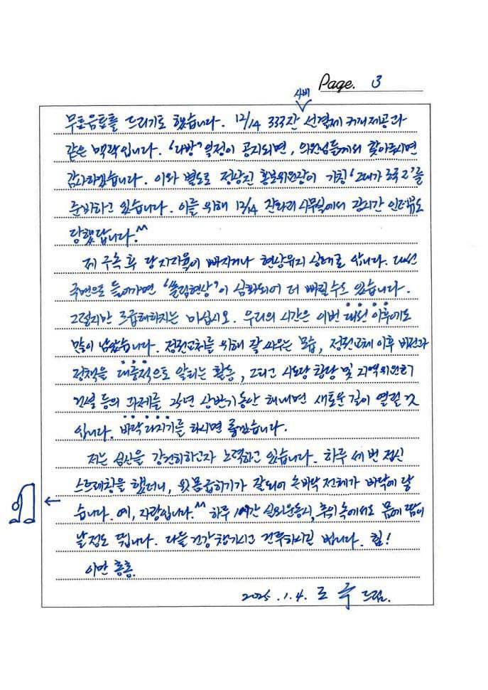 조 전 대표는 지난해 12월 12일 내려진 자신의 대법원 선고에 대해서는 "여전히 승복할 수 없지만 감수해야 한다”라고 말했다. 이어 "다만 윤 탄핵소추 의결을 보고 (구치소에) 들어왔기에 약간의 위로를 얻는다”라며 "나는 법적으로 '패배'하였을지 모르나, 정치적으로는 '승리'했다”라고 자평했다.