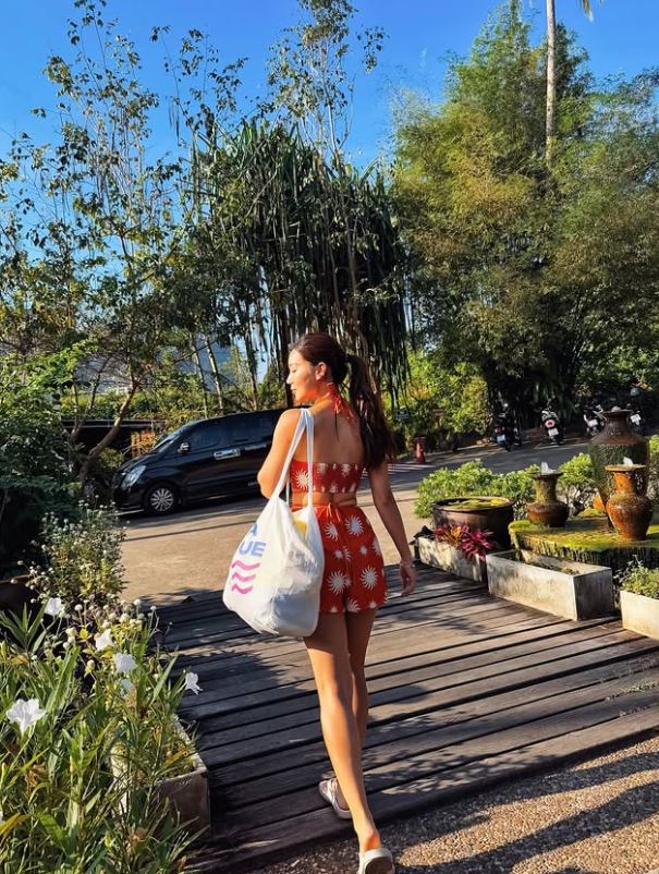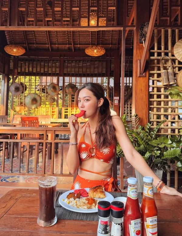 그는 주황색 바탕에 흰색 무늬가 들어간 비키니를 입고 음식을 즐겼다. 또 다른 사진에서는 벤치에 ㅇ낮아 작은 고양이와 시간을 보내는 모습으로 힐링을 자아냈다.