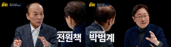 ‘특집 썰전’ 첫 회에는 썰전에서 활약했던 ‘보수의 아이콘’ 원년멤버 전원책 변호사와 ‘판사 출신 법잘알’ 박범계 의원이 출연한다. 윤석열 대통령의 체포 영장이 초읽기에 들어간 가운데, 두 사람은 탄핵 정국 주요 이슈를 두고 첨예한 시각 차이를 펼칠 예정이다. 최근 진행된 녹화에서 윤석열 대통령의 체포 영장 집행·내란죄 빠진 탄핵 소추안 등의 사안을 두고 강렬한 설전이 오갔다는 후문이다.