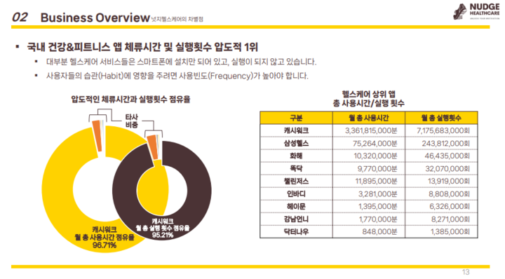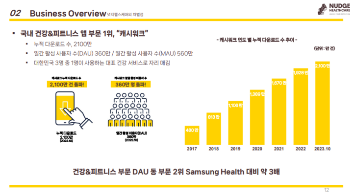 적립형 만보기 어플계 조상 '캐시워크'는 지난 2023년 10월 기준 누적 다운로드 수 2,100만 건으로 스마트폰에 한 번도 안 깔아본 사람을 찾는게 더 힘든 어플이다. 국내 건강, 피트니스 앱 체류시간 및 실행횟수 1위로 2위를 달성한 '삼성헬스'의 3배 규모다.