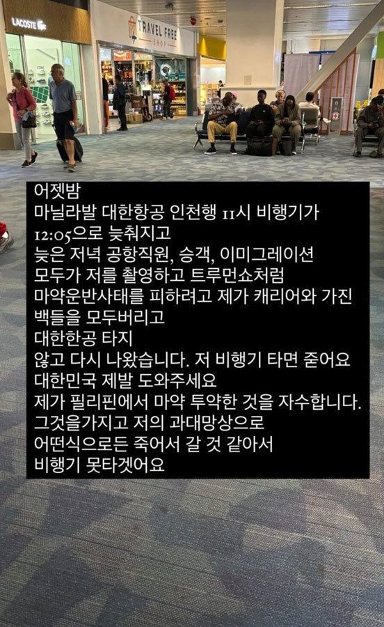 당시 그는 "마닐라 콘래드 호텔이다. 생명의 위협을 받게 됐다. 공항도 무서워서 못 가고 택시도 못 타고 있다. 도와달라"며 "한국에 가고 싶다. 비행기 타고 마닐라에서 나가면 죽을 것 같다. 제가 필리핀에서 마약 투약한 것을 자수한다. 어떤 식으로든 죽어서 갈 것 같아 비행기 못 타겠다"고 다소 이해가 어려운 글을 통해 구조를 요청했다.