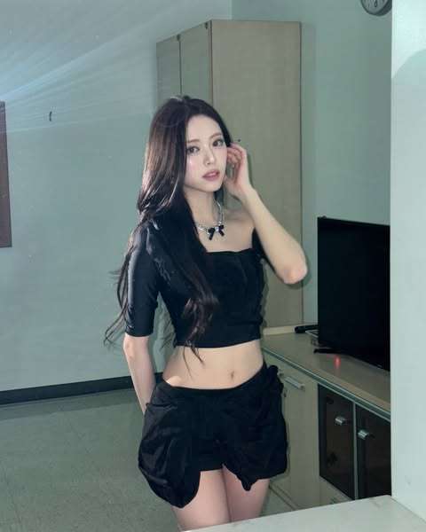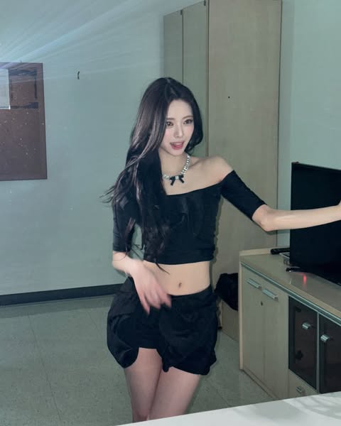 한쪽 어깨가 드러난 오프숄더로 쇄골 라인을 뽐냈으며, 군살 없는 복부와 특유의 골반을 부각하는 검은색 스커트로 완벽한 몸매를 자랑했다.