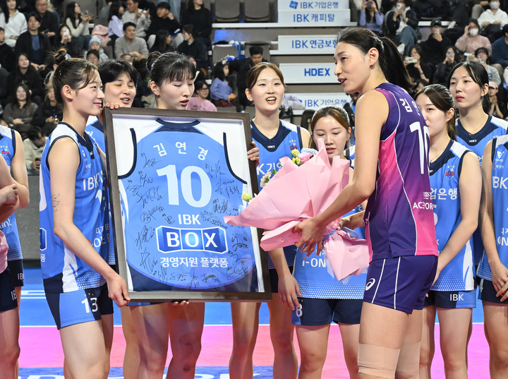 특히 이 날 IBK기업은행 측에서 준비한 은퇴 선물이 눈에 띄었다. 김연경의 백넘버 10번을 새긴 기업은행의 특별 제작 유니폼에 선수들과 김호철 감독의 사인을 담아 액자에 장식한 선물이었다.