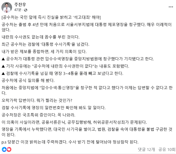 한편 주 의원은 자신의 페이스북에 “공수처가 대통령 내란 혐의 관련 압수수색 영장을 서울중앙지방법원에 청구했다가 기각됐고, 기각 사유에 ‘내란죄 수사권이 없다’고 명시돼 있었다는 제보가 있다”면서 “공수처가 검찰에 수사 기록을 넘길 때 3~4통의 영장을 빼고 보냈다는 의혹도 함께 받았다”고 다시 한번 지적했다.