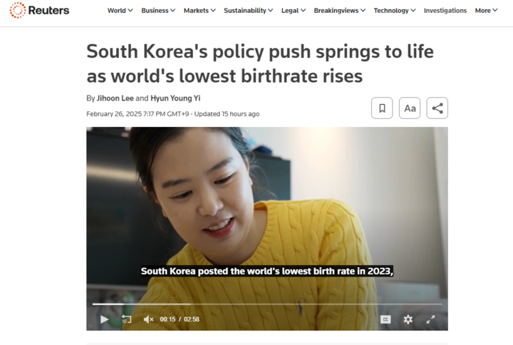 지난 26일 발표된 2024년 연간 합계출산율과 관련해 로이터통신은 ‘세계 최저 출산율 반등으로 생명력 얻게 된 한국의 저출산 정책’이라는 제목의 기사를 게재했다.