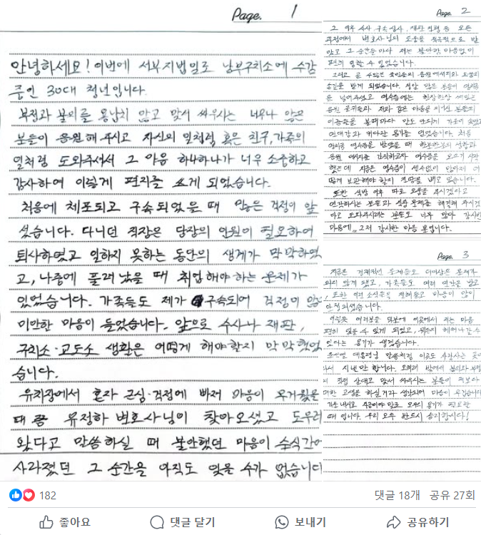 (MHN스포츠 주진노 기자) 서부지법 사태로 남부구치소에 수감 중인 30대 남성이 변호사들의 조력을 강조하는 편지를 공개하며 허위 사실에 대한 반박에 나섰다.