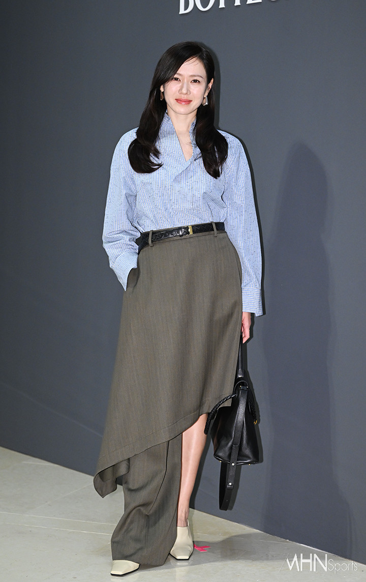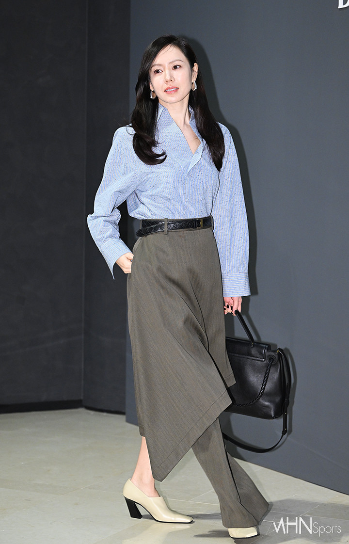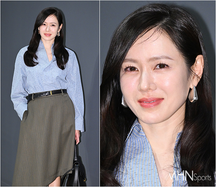 이날 손예진은 블루 스트라이프 패턴이 돋보이는 오버사이즈 셔츠에 비대칭이 포인트 된 스커트에 트라우저 스타일이 가미된 감각적인 룩을 선보였다.