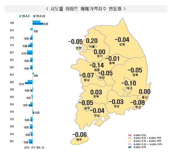 경기도도 하락세를 멈추고 보합 전환했다. 특히 과천이 0.71% 상승하며 강한 상승세를 보였고, 용인 수지구도 0.17% 올랐다. 반면, 인천은 0.05% 하락하며 송도가 있는 연수구(-0.12%)를 중심으로 약세가 이어졌다. 지방에서는 5대 광역시(-0.07%), 세종(-0.14%), 8개 도(-0.03%) 등이 모두 하락하며 서울과의 온도 차가 뚜렷했다.