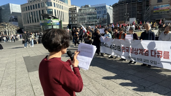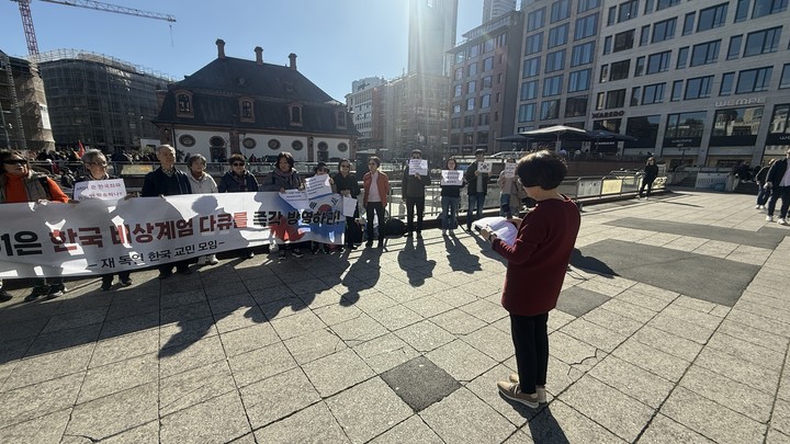지난 22일 독일 프랑크푸르트 중앙역 인근 Planskizze Hauptwache 광장에서 20여 명의 재독 한인들이 모여 윤석열 대통령의 조속한 복귀와 독일 공영방송 ARD의 한국 비상계엄 관련 다큐멘터리 방영을 촉구하는 시위를 벌였다.