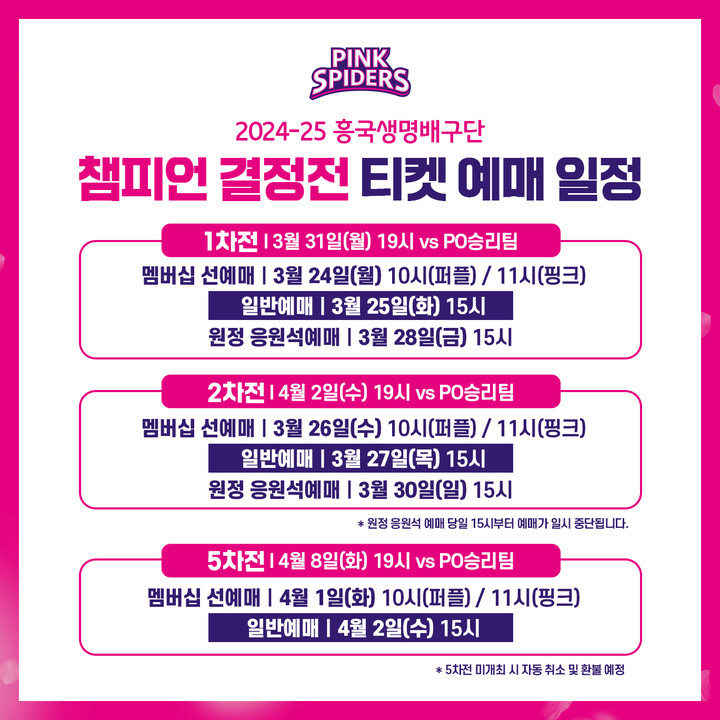 챔프전 티켓은 한국배구연맹(KOVO) 홈페이지를 통해 예매할 수 있다. 흥국생명 멤버십 클럽퍼플 회원은 24일 오전 10시, 클럽핑크 회원은 11시부터 가능하다. 일반 팬들은 25일 오후 3시부터 티켓을 구매할 수 있다.