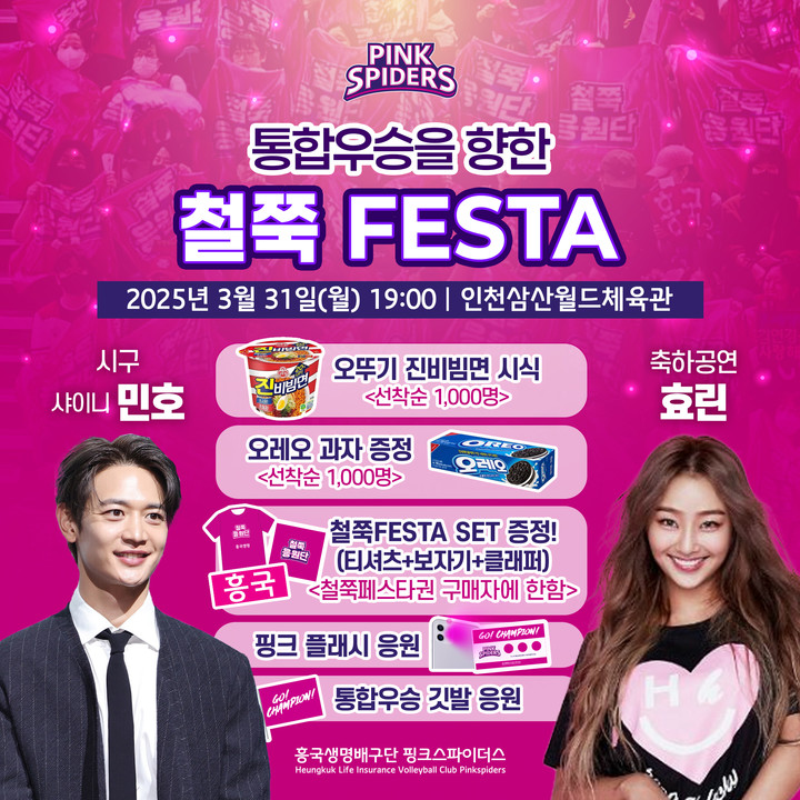 흥국생명배구단은 "2024-2025시즌 챔피언결정전을 앞두고 6년 만의 통합우승을 기원하는 팬 이벤트를 마련했다"며 "정규리그 1위에 이어 챔프전 우승을 위한 구단과 팬들의 열망을 모으고, 봄 배구의 열기를 더할 '철쭉 페스타(FESTA)'를 개최한다"고 24일 밝혔다.