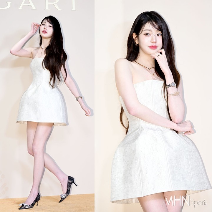 장원영은 클래식하면서도 세련된 실루엣의 화이트 드레스를 완벽하게 소화하며 눈길을 끌었다. 자연스러운 웨이브 헤어스타일은 부드럽고 여성스러운 이미지를 강조했다.