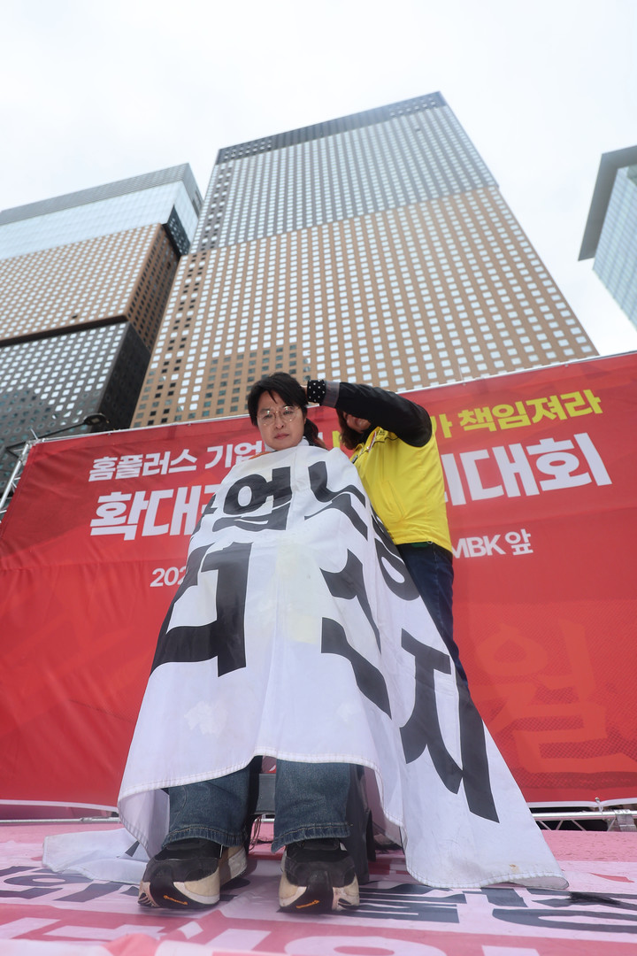 안수용 위원장은 삭발 후 "오늘의 삭발은 단순한 상징 의식이 아닌 노동자들의 피눈물, 우리 가정의 생존, 우리가 사랑하는 홈플러스를 지키기 위한 절박한 외침"이라며 "MBK는 홈플러스를 돈벌이 도구로 전락시키고 이제 기업 회생이라는 이름 아래 청산하려 하고 있다"고 강하게 비판했다.