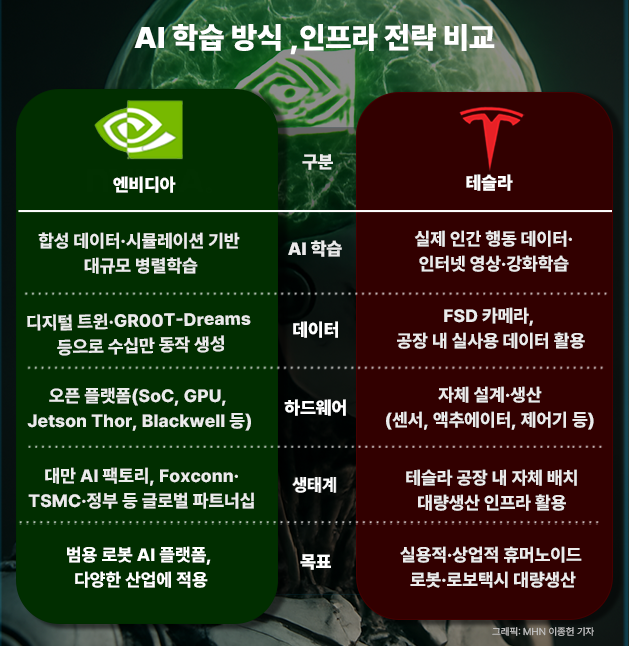 (MHN 이종헌 기자) 엔비디아와 테슬라는 로봇을 ‘똑똑하게’ 만드는 방식부터 근본적으로 다르다.