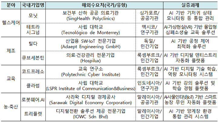 本事業は、欧州、北中米、アジアなど3大陸6カ国の現地パートナーと協力しながら、韓国のAIソリューション企業がヘルスケア、製造、教育、農畜産の4大分野で本格的な技術実証を推進することを目的としている。