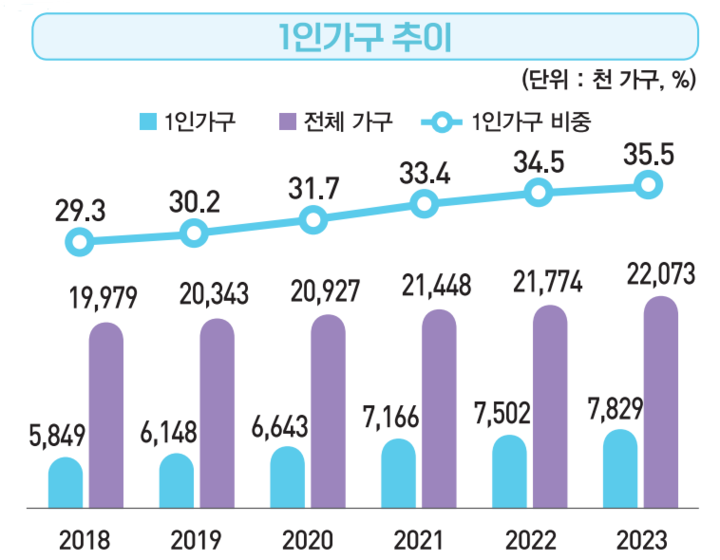 통계청의 자료에 따르면, 국내 1인 가구는 최근 20여 년간 빠르게 증가해왔으며, 2000년 전체 가구의 15.5%에 불과했던 1인 가구 비율은 2023년 35.5%로 두 배 이상 늘었다.