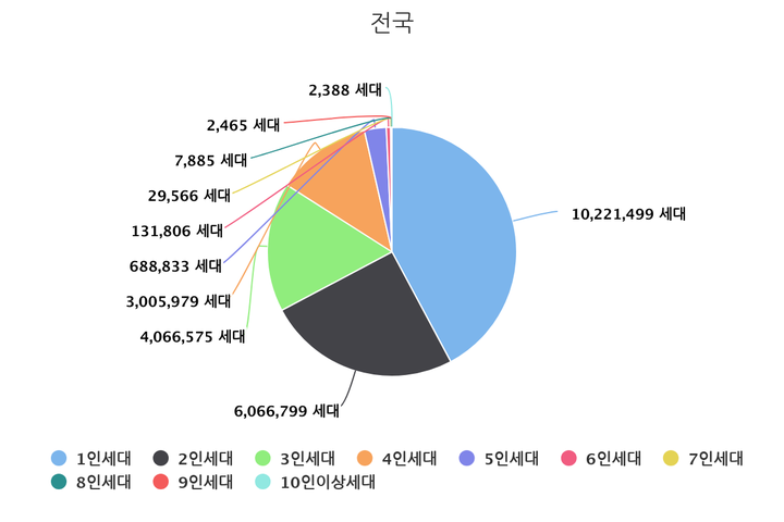 특히, 2024년 3월 기준 행정안전부 주민등록 통계에서는 전국 1인 가구가 1,002만 가구로, 전체 가구의 41.8%에 달하는 것으로 집계되기도 했다.