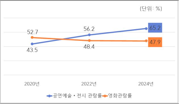 최근 발표된 서울문화재단의 '서울시민 문화향유 실태조사' 결과에 따르면, 영화에 집중됐던 관람이 공연예술 및 전시로 다변화하고 있음이 나타났다. 처음으로 공연예술 및 전시관람(56.2%)이 영화 관람(48.4%)을 뛰어넘었던 지난 조사에 이어 이번에도 65.2%와 47.9%로 격차가 더 벌어졌다.
