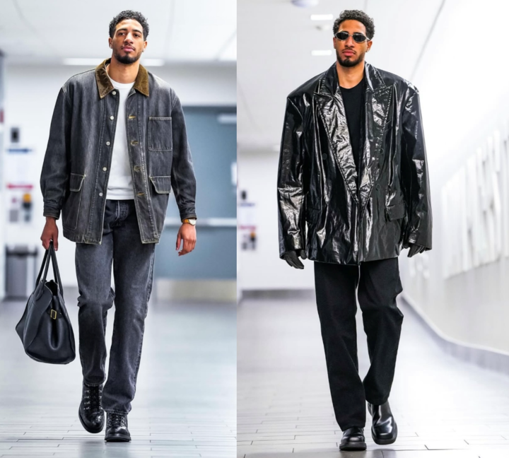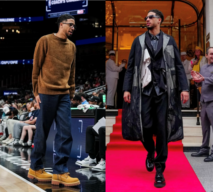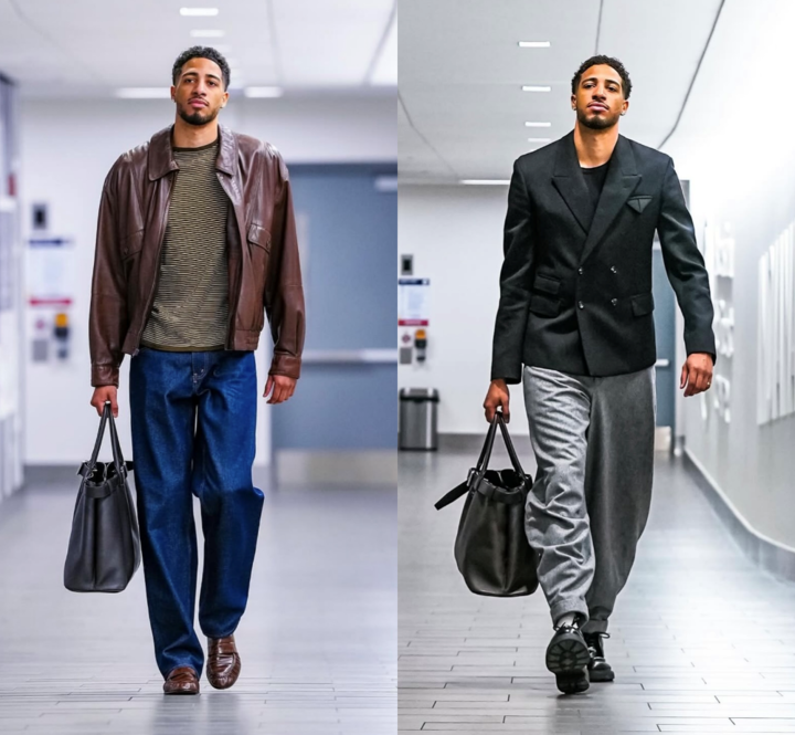 블랙 더블 브레스티드 블레이저는 날렵한 실루엣을 강조하고 있으며, 타이리스 할리버튼의 신체 비율을 잘 살린 우아하고 정제된 룩을 완성하면서 세련된 매력을 한층 더 끌어올린다. 여기에 믹스 매치된 그레이 컬러의 와이드 스웻 팬츠는 부드럽고 흐르는 듯한 핏으로, 세미 캐주얼과 포멀함을 조화롭게 결합한다. 마찬가지로 블랙 가죽 토트백과 블랙 로퍼는 통일된 컬러감을 통해 룩의 포인트로 작용하며 세미 캐주얼한 포멀룩의 균형을 잡아준다.